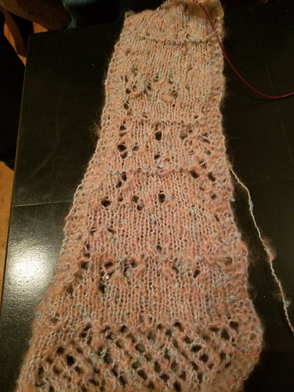 Remember how L was working on green? It’s a pattern that Madrona put out in 2014 for the event. Well, yesterday, while waiting for Pam, L had to frog and tink and was *very* mildly irritated with a mistake somewhere in her knitting. Meanwhile, I was knitting away on this scarf. Then I got super excited. I had had a mutation!