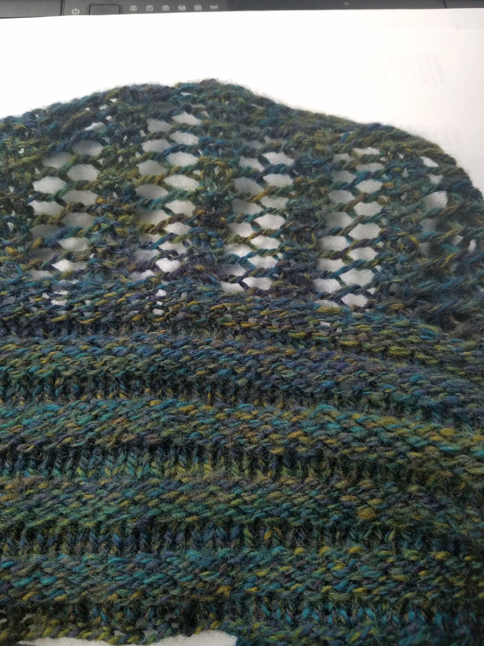Well, except, I modified the pattern for two colors vs. one. But that doesn’t count, right? Well, um, yeah, it does in this case. So, I had made an adjustment, but I didn’t carry that adjustment throughout the project. It’s like doubling a batch of chocolate chip cookies, but not doubling the chocolate chips. It’s fine, I guess. In this case, I did not take into account how my alterations would necessitate altering directions later on. The way the lace happens in this pattern, you do short rows of stockinette lace, and then when you are done, you just knit off into the sunset. But, that means that only 1/2 of your lace insert is knitted on that row. When you come back, the rest of the lace insert is knitted, but now, it’s showing as purl. So, an adjustment must be made. I chose to leave this like it is on this first insert. It’s rustic looking anyway, it’ll be fine. But, in the next insert, on the way back, I switched from knit to purl on that last 1/2, so the insert is all smooth. This *does* mean that I have a section of not quite garter for one row, but that was more acceptable to me than the 1/2 in 1/2 out visual experience that dogmatically following the rules gave me. OK fine, you purists!!! *dogmatically following the rules after I threw them out the window in the first place. I suppose one should learn to follow a change through the whole process to make sure one understands how the change could affect things in the future. One should also live a little.